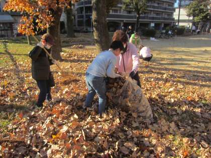 3チームに分かれて、落ち葉を集め、袋に詰めていきます。30分ほどの活動時間でしたが、葉っぱでいっぱいになったビニール袋がいくつもできました。ビニール袋に入れるときにしっかりと押し込まないといけないのが、結構大変でしたが、とても上手にできていましたとお褒めの言葉をいただきました。