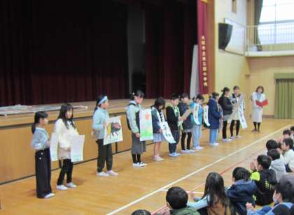 お話の後は、表彰と紹介がありました。表彰は、大阪市読書感想文コンクールの学校図書館協議会賞でした。紹介されたのは、文化のつどいで出品した習字や絵画などの金賞受賞作品と、習い事で賞をいただいた硬筆の作品でした。また、赤い羽根共同募金の感謝状も紹介されました。募金総額は、11,672円でした。ご協力ありがとうございました。