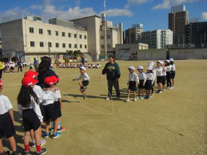 「スピード8の字」で5分間に何回とべるかの記録をとります。2年生、練習の成果が出ていました。リズミカルにとんで、145回の記録をマークしました。1年生も負けていません。先生の「ハイッ! ハイッ! ハイッ!」のリズムに合わせて、88回とべていました。本番に挑んで、初めてとべた子もいたそうです。