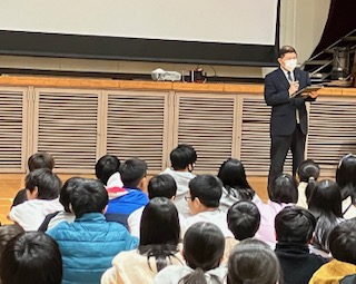 中学校の校長先生から、交流会の目的を聞き、その後、3グループに分かれて体験授業を受けました。授業後に再度集合し、生徒会やクラブの説明や紹介を聞きました。