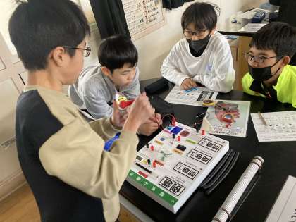 手回し発電機を使った実験では、自分たちで作った電気を熱・運動・音・光に変えて使うことを体験しました。自分たちで簡単に電気を作りだせること、電気は身の回りのいろんなところで使われていることを知れたようでした。