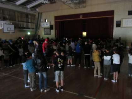 今日は火曜日ですが、23日(木)の集会が「卒業を祝う会」の準備の時間になるため、児童集会「かげを当てよう!」がありました。