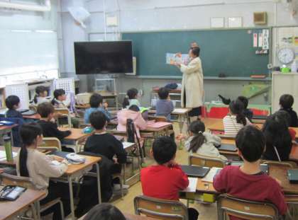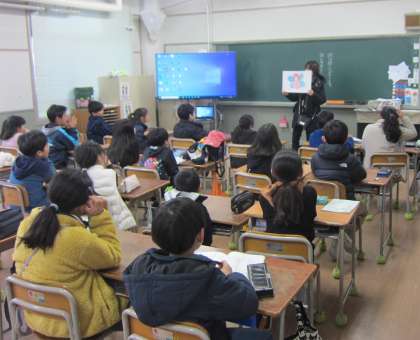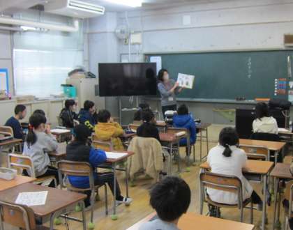 低学年の教室では、絵本を読んでもらっているクラスが多かったです。どのクラスでもみんなしっかりと前をむいて、楽しそうにお話を聞いていました。