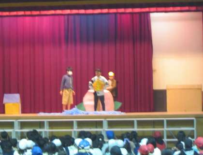 木曜日の朝は、児童集会です。今朝はゲームではなく、集会委員会がオリジナル劇「金太朗」をしてくれました。