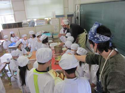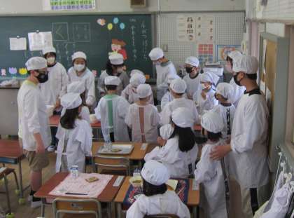 最初の週は、6年生が運搬や配膳を全部していたのですが、この日からは、6年生に手伝ってもらったり教えてもらったりしながら、1年生も配膳に挑戦です。パンをお皿に入れたり、ジャムやおさつチップスの小袋を配ったりしました。6年生がやさしくアドバイスしている姿が素敵でした。