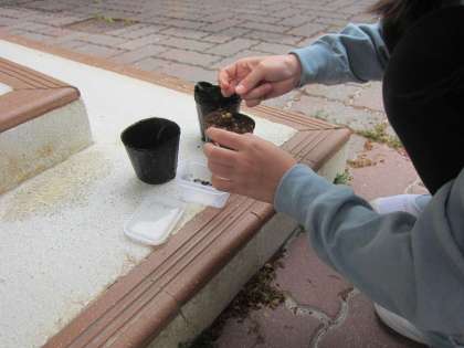 公園の花壇に植えるヒマワリの種をビニルポットにまきました。