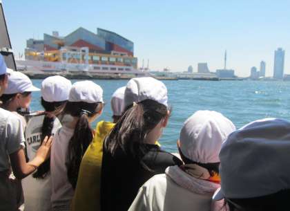 天保山の公園でお弁当を食べた後、天保山と桜島をつないでいる天保山渡船に体験乗船させていただきました。潮風を浴びながら、USJや海遊館を見つけて、大喜びしていました。「初めて船に乗った!」という子も多く、貴重な体験になったようでした。