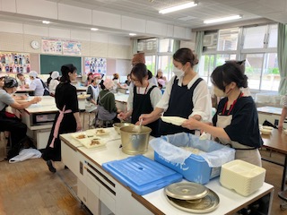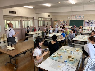 そのあと、いよいよ給食の試食です。エプロンやバンダナをつけ、配膳も保護者の皆様でしていただきました。安全面に配慮し、とても美味しく調理されていて、「給食」のイメージが変わった方もいらっしゃるのではないでしょうか。