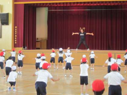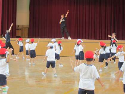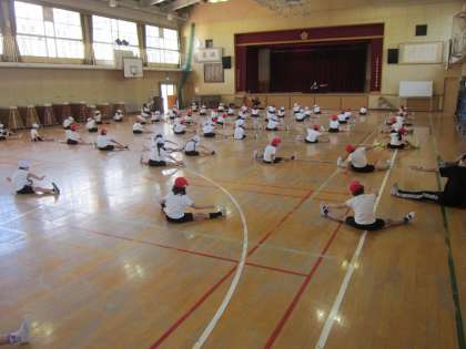 リズムに合わせてストレッチをしたり、先生の動きのまねをしたりしてウオーミングアップは完了です。