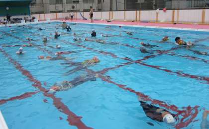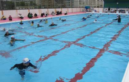 先ずは、長袖、長ズボンで、水中を走ったり泳いだりして、濡れた服の重さや、動きづらさを体験しました。