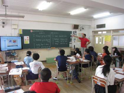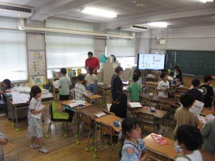 3年生は、「How many 〜?」と、リンゴの数や漢字の画数を友だちと聞いたり答えたりする活動をしました。担任と見本を見せながら、質問の仕方や答え方を教えてくださってました。