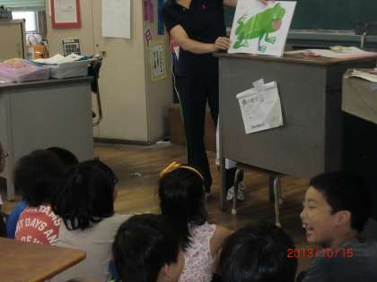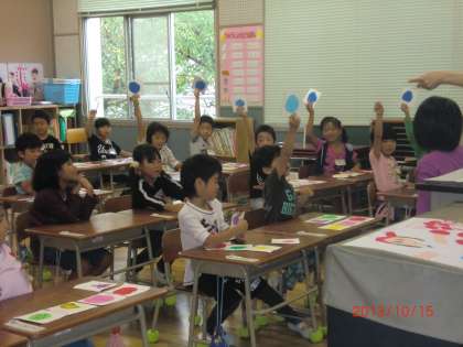 10月15日(火)連休明けの火曜日の朝はフォニックスで始まります。英語のあいさつの後,DVDをみて、きいて、ABCソングを歌いました。2年生は英語の絵本を見ながらお話を英語でききました。子どもたちはとても楽しそうな表情でした。どの学級も英語が流れていました。今週も頑張りましょう。レッツゴー!