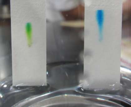 ペーパークロマトグラフィーという、ろ紙と水だけで、水性ペンのインクの色を分ける方法を教わりました。早速、実験開始です。
