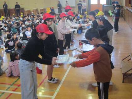 児童朝会の時間に、先日の全校オリエンテーリングの表彰式がありました。