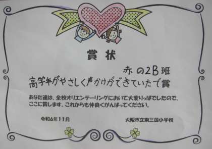 当日の様子をもとに、代表委員会でいろいろな賞を考え、表彰状を作成しました。「へとへとになりながらもたどりついたで賞」や「低学年にやさしくできたで賞」「みんなで気持ちを1つに手を握っていたで賞」「見事な作戦だったで賞」などなど、ユニークな賞がたぁ〜くさん準備されていました。