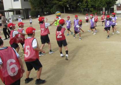 2・3時間目を使って、1年生と2年生が「ドッジボール大会」をしました。