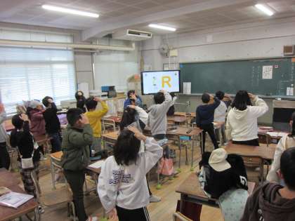 3年生が、アルファベットの歌を、ポーズをとりながら歌っていました。O、P、Q、R、S、T、U… Vは簡単かな?と思ったら、Yとの区別をするためか、予想外のポーズでした!
