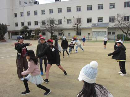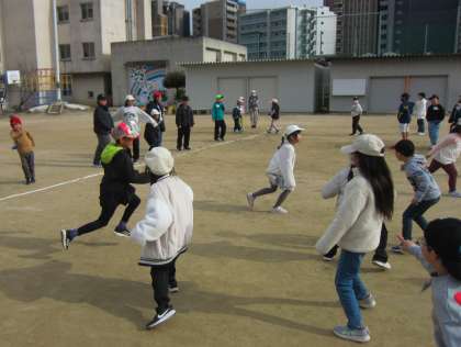 今日は、赤色チームの12班が「ブルラッシュ」という遊びで楽しみました。2本の線の間を、中にいる鬼に捕まらないように駆け抜けます。代表委員会が司会をし、「白い服を着ている人」や「サッカーの好きな人」といったお題を出してくれていました。鬼の人は、捕まえるときにタッチだけではなく、名前を呼びます。班の友だちの名前をおぼえていないと、捕まえることができません。