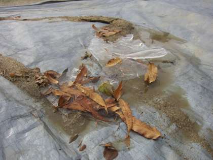 砂場の上に敷いているシートにできた水たまりが凍っていました。休み時間には雪もちらついていましたが、子どもたちは、外で元気に遊んでいます。