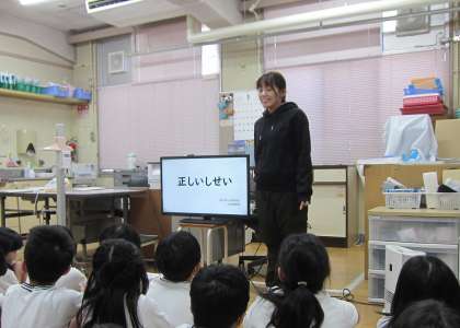 2年生は、「正しいしせい」について話を聞きました。教室での姿勢、いつも、どんなのかな? 姿勢がよくなると、字がきれいになったり、走るのが早くなったり、背も伸びるんだそうです。