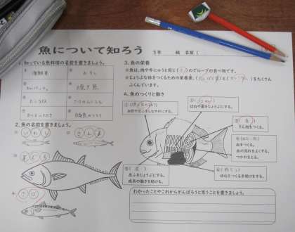 5年生が「魚について知ろう」というテーマで、栄養学習に取り組みました。