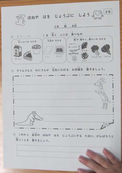 2年生が「ほねやはをじょうぶにしよう」について栄養学習に取り組みました。