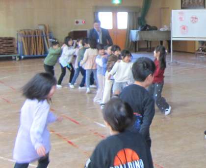 あいさつや食べ物を教えてもらった後、掛け声とともに相手のこの指をつかむ遊びや、中国版のことり鬼のような「老鷲捉小鶏」で、楽しみました。