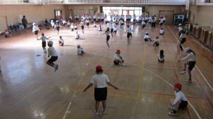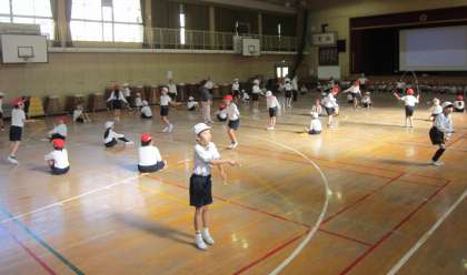 2人組になって、3年生は「あやとび」4年生は「交差とび」の回数を競いました。3分間で、何回とべたか数えます。それぞれ、自分のベスト記録に向けて、がんばって跳びました。