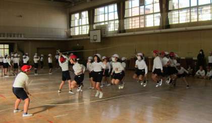 「10人一斉とび」と「スピード8の字とび」の5分間でとべる回数をきそいました。