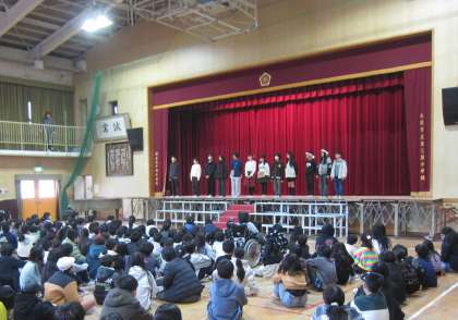 小道具や舞台背景も工夫して、楽しい劇を演じました。魔女になったカービーとポニョというふたりの女の子が、クイズをクリアしていくというお話でした。楽しい場面が多くあり、講堂中に笑顔があふれていました。