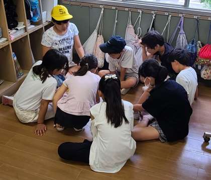 今朝の児童集会の時間は、明日の全校オリエンテーリングに向けて、たてわり班の教室に集まって話し合いをしました。