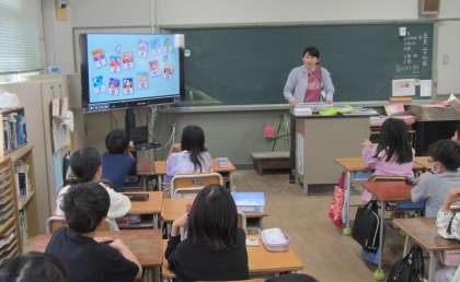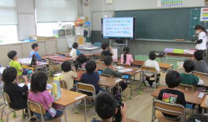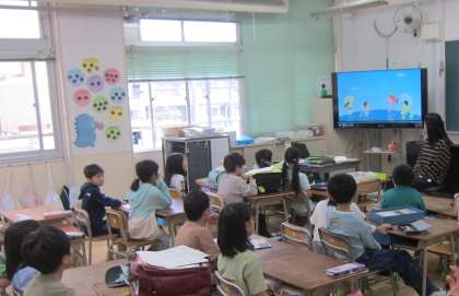 1年生がアルファベットの歌を元気よく歌っていました。2年生は英語のお話を聞いていました。3年生は1月から12月の歌を自分の誕生月に立ち上がって歌うゲームをしていました。