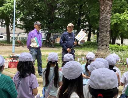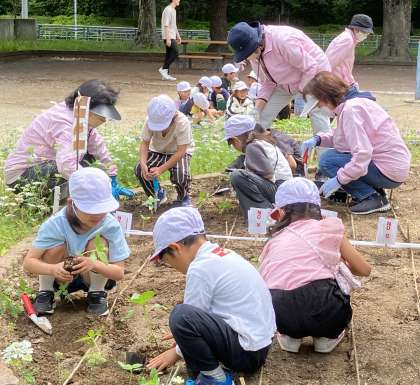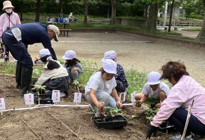 5月2日に地域の人とまいたヒマワリの種から育てた苗を、十八条東公園の円形花壇に植えました。地域の人に植え替えの仕方を教えていただき、手伝ってもらいながら植え替えました。苗の根元を指ではさんで、ビニルポットごとくるっとひっくり返します。困っていると地域の方がそっと手伝ってくださいます。無事、全員が苗植えをさせていただくことができました。