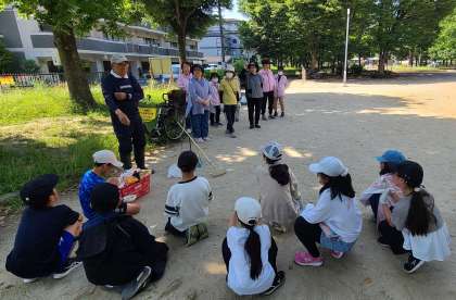 終わった後、地域の方から、普段の清掃の様子や、公園の歴史について教えていただきました。十八条東公園は、前回の万博の時に地下鉄の開通と同時に整備されたのだそうです。それまでは一面、水田が広がっていたそうです。