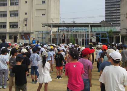 今朝の「児童朝会」での校長先生のお話は、「スクールフェスティバル」と「引き渡し訓練」についてでした。