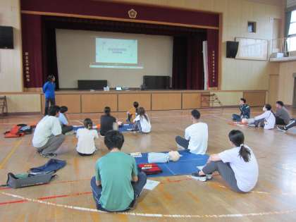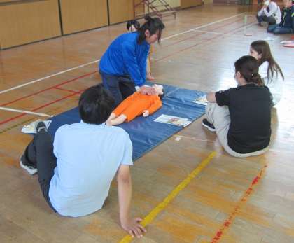 消防署から心肺蘇生訓練用人形をお借りして、全員が胸骨圧迫、AEDの使用法の訓練をし、万が一に備えました。