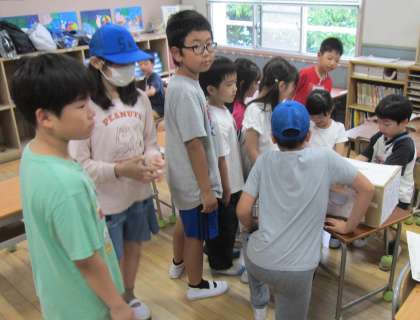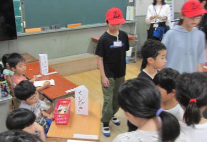 1年生の遊びコーナーは、「くじ引き クイズ屋さん」と「なかみはなあに」でした。