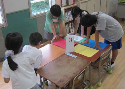 1組の「クイズ屋さん」は、くじ引きをして、問題ブースへ行きます。4枚の色画用紙の中から1枚引くと、その裏に問題があります。シルエットクイズでは、「ドラえもん」の鈴が!…と思ったら、正解は「ドラミちゃん」でした。これは難問!!