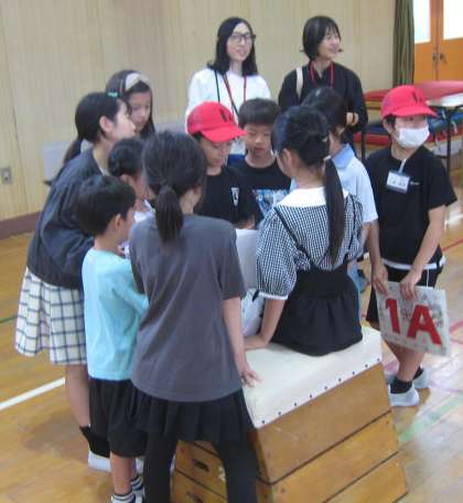 5年1組は「1位を目指せ! 東三国ミニ体育祭」を講堂でしました。ブースごとに、ゲームに挑戦します。バスケットボールのシュートが難しそうでした。