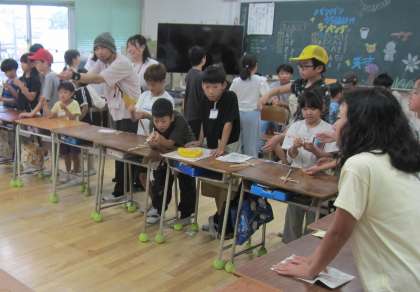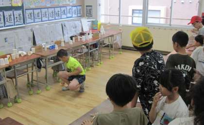 5年2組は「バンバンうちぬけ!」です。ゴムてっぽうで、紙コップの積まれた的を狙います。当たってもはじき返されたりもして、なかなか崩せませんでした。