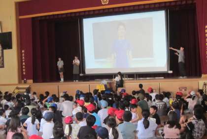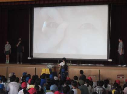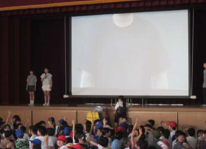 講堂の大きなスクリーンに映された先生の顔のアップの写真を見て、誰先生か考えます。目や口がアップになった写真を見て、三択の中から、答えをたてわり班で相談しました。