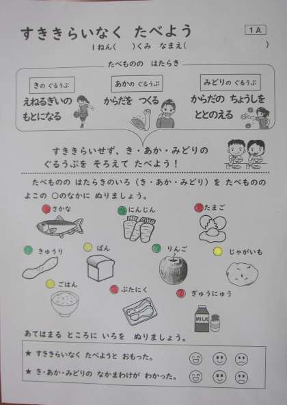 授業の終わりには、パン、肉、野菜などのいろいろな食材がどのグループに属するのか考えました。ジャガイモが難しかったようで、野菜の仲間だから「みどり」と思ったようで、エネルギーのもとになる「きいろ」のグループですと言われ、驚いていました。