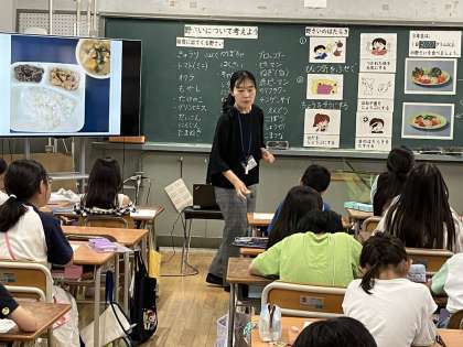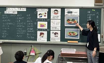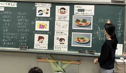 給食に出てくる野菜の種類を考えたり、野菜のはたらきについて教えていただいたりしました。また、野菜をたくさん食べるための工夫について考えました。