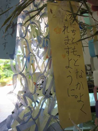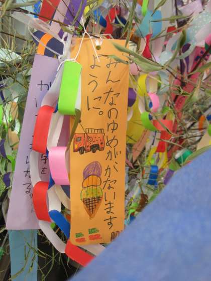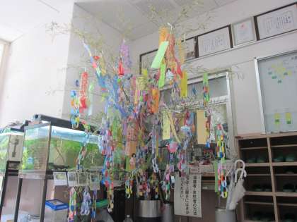 3年生が、地域の人と作成した笹飾りを玄関に飾っています。