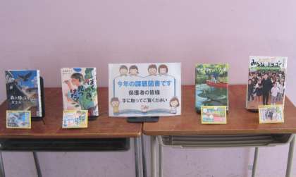 階段を上がったところに、学校図書館司書の先生が、「青少年読書感想文全国コンクール」の課題図書の展示コーナーを準備してくださいました。高学年の課題図書は、「ぼくの色、見つけた!」「森に帰らなかったカラス」「マナティーがいた夏」「とびたて!みんなのドラゴン」の4冊です。懇談会の合間に、少し手に取ってみてください。