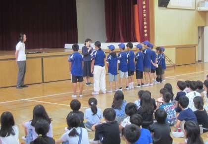校長先生のお話は、1学期にできるようになったことをふりかえってみましょう。たくさんあるできるようになったことの中には、クラスの友だちやクラスで取り組んだこともありますね。これからも、友だちや先生、学校を好きになってくださいね。というものでした。