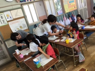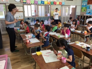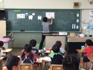歯磨きタイムでしっかり歯が磨けているか、歯垢そめだしでチェックをします。赤いところが磨き不十分なところです。この結果を受けて、毎日しっかり歯を磨きましょう。
