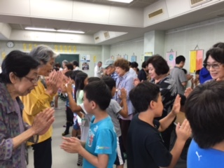 毎年、3年生が地域のお年寄りの皆様とのふれあいの会に出席しています。今年は、「赤い屋根の家」を歌い、リコーダーで「河はよんでいる」と「かっこう」を演奏しました。その後、七夕の短冊を一人ずつ披露し、ささにつけていただきました。最後に、小学生とお年寄りがペアを作り、「茶摘み」を歌いながら手遊びをしました。