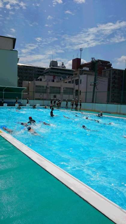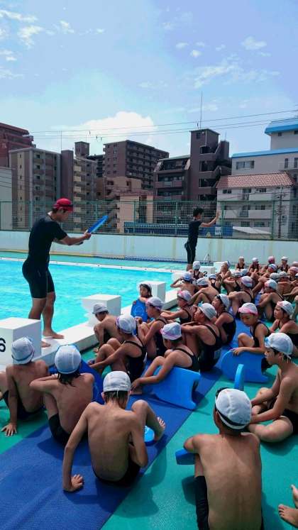 2時間目に5、6年生が、3時間目に3、4年生が外部講師の先生にクロールの息つぎの仕方や腕のかき方を教えていただきました。