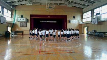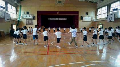 今日は、講堂でキャンプファイアで踊るフォークダンスの練習をしました。軽快な音楽に合わせて楽しそうに踊っていました。